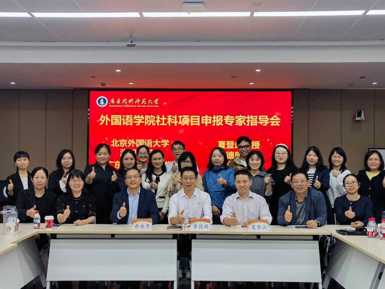 为进一步推动2026年度国家社科基金项目的申报工作,提升我院教师在国家级项目申报中的质量与立项成功率,2025年12月2日,广东技术师范大学英国威廉集团官网特邀北京外国语大学夏登山教授、澳门大学李德凤教授、广东外语外贸大学冉永平教授来校开展专题指导。会议由徐玲院长主持,杨伟光书记、王永建副院长、陈倩副院长、拟申报国家社科项目的教师及近三年新进博士共同参与。